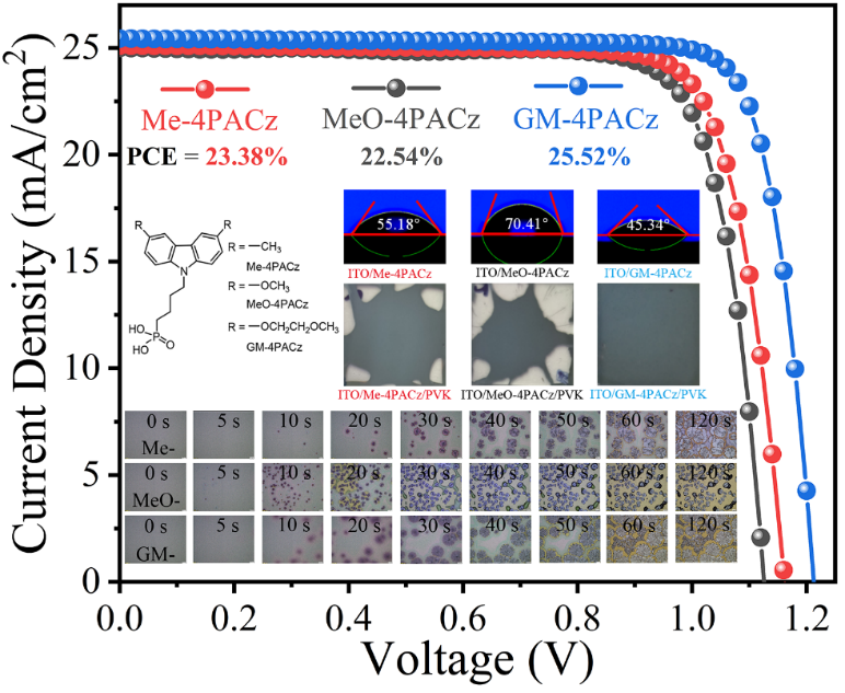 鉴于以上问题,公司刘治科教授团队开发合成了一种新型OSAM,在咔唑基单元引入乙二醇单甲醚(GM)侧链,将合成所得的4-(3,6-乙二醇单甲醚-9H-咔唑-9-基)丁基]膦酸(GM-4PACz)作为空穴传输层。GM基团的引入增强了氧化铟锡(ITO)/SAM衬底的表面能,以促进钙钛矿薄膜的成核和生长,抑制阳离子缺陷,释放SAM/钙钛矿界面处的残余应力,并优化能级排列。最终,基于GM-4PACz的IPSC实现了25.52%的光电转换效率,1.21 V的高开路电压(VOC)和优异的稳定性,器件在空气中老化2000小时后保持初始效率的93.29%,在最大功率点跟踪1000小时后保持初始效率的91.75%。