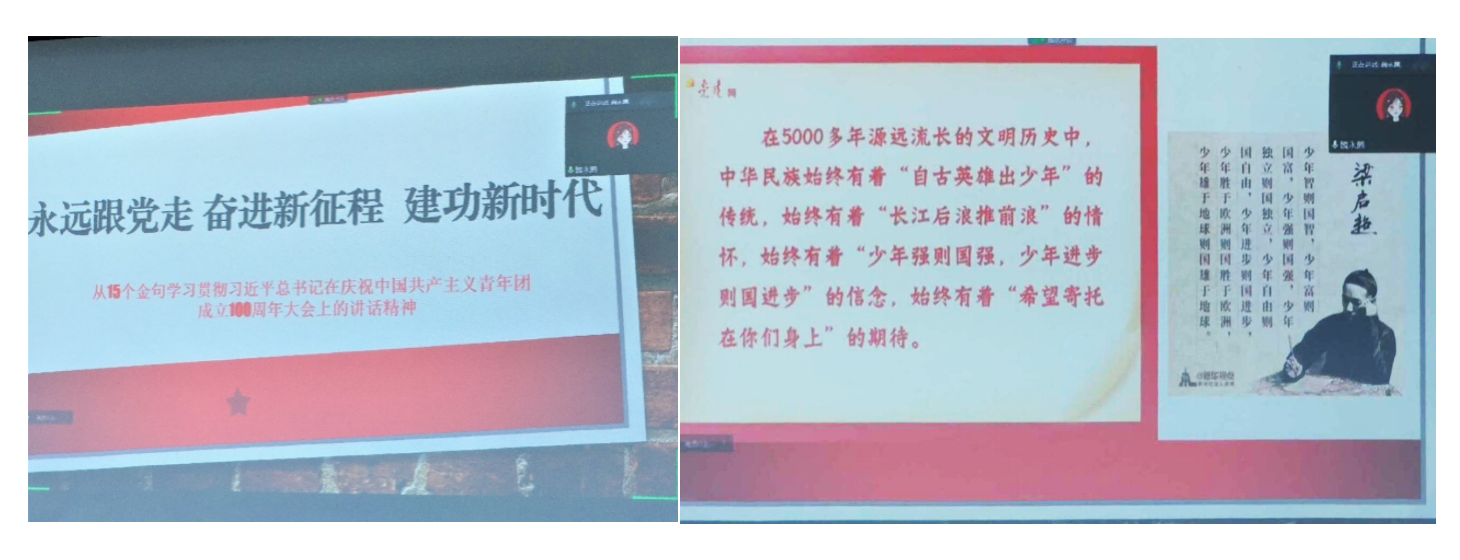 首先,团委书记胡雯洁从十五个金句着手,带领大家从四个方面学习了习近平总书记在庆祝中国共产主义青年团成立100周年大会上的讲话精神。