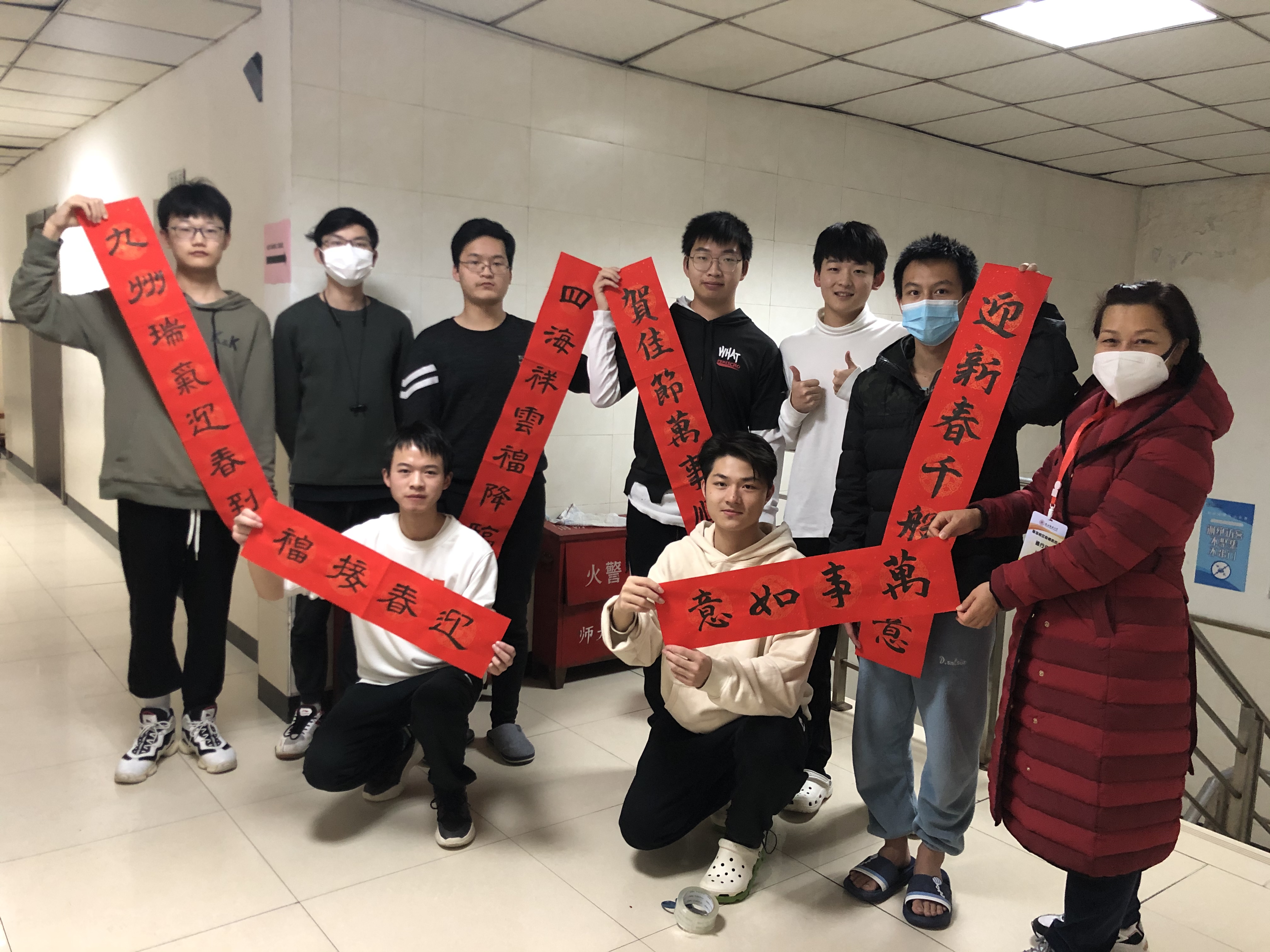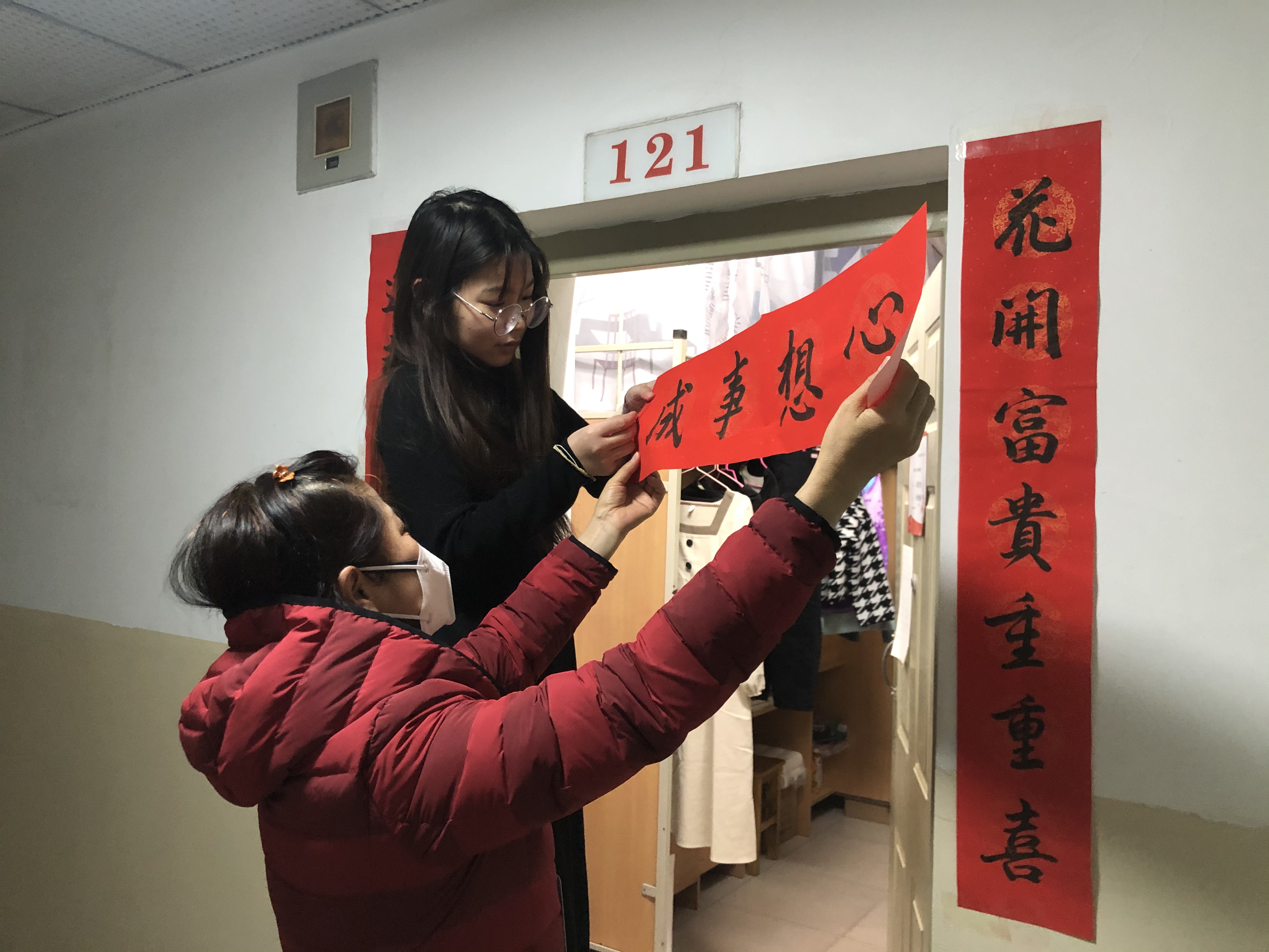 活动中,靳春泓为同学们送上了手写春联,并在现场与同学们共同张贴。