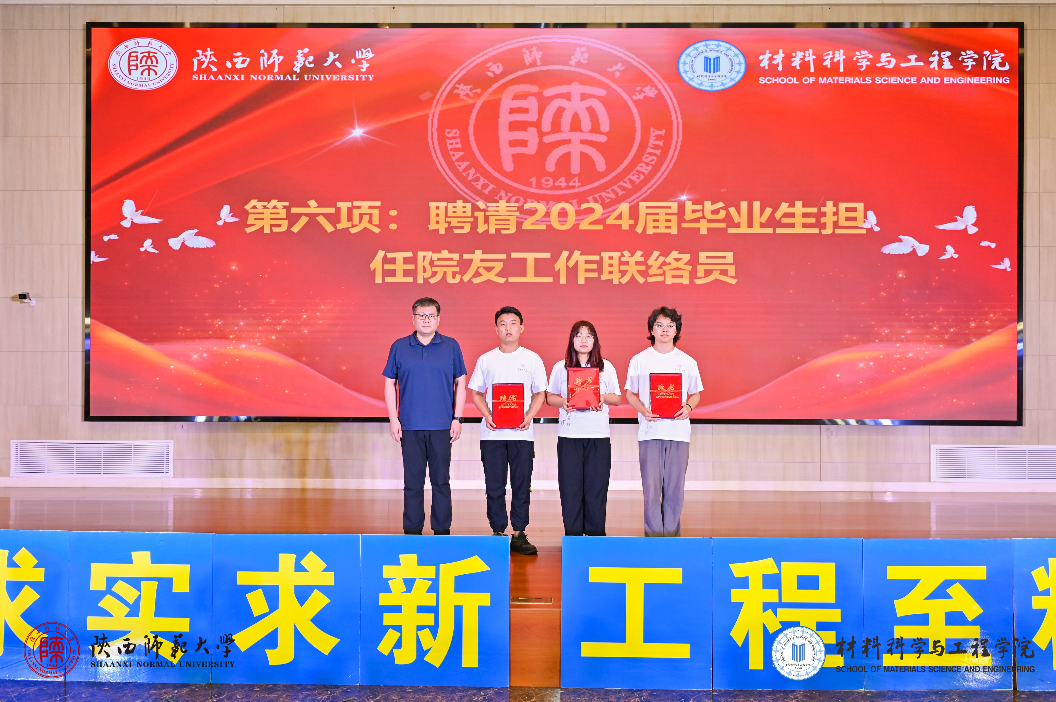 江瑞斌副经理宣读《关于聘请2024届毕业生担任院友工作联络员的决定》,郑鹏书记为院友工作联络员颁发聘书,为毕业生与母校的持续联系搭建了桥梁。